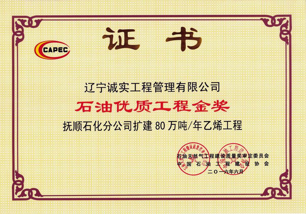 2016年石油優(yōu)質(zhì)工程金獎(撫順石化分公司擴建80萬噸/年乙烯工程)
