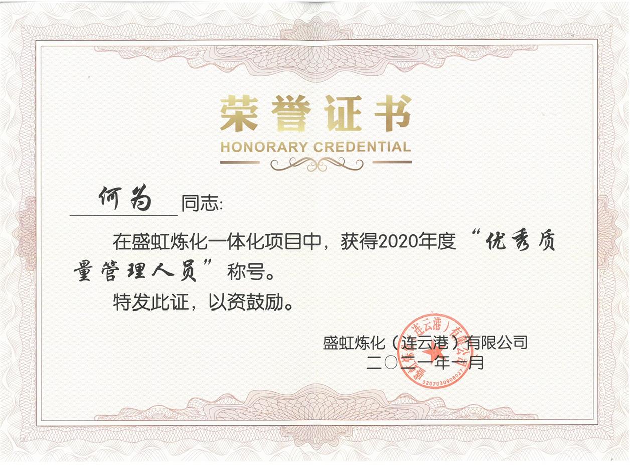 熱烈祝賀何為同志榮獲盛虹煉化一體化項(xiàng)目2020年度“優(yōu)質(zhì)質(zhì)量管理人員”榮譽(yù)稱號(hào)