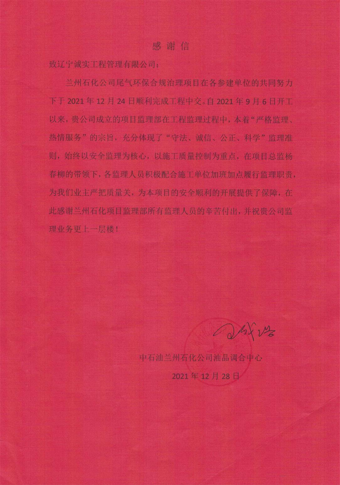 12月28日,蘭州項(xiàng)目監(jiān)理部收到中石油蘭州石化公司油品調(diào)合中心發(fā)來的感謝信。信中,業(yè)主單位對項(xiàng)目部全體監(jiān)理人員在項(xiàng)目開展過程中的工作表現(xiàn)給予了充分的肯定和高度的贊譽(yù)。這是對我公司卓越的項(xiàng)目管理水平和強(qiáng)大的人才隊(duì)伍的最好見證,同時也完美的展現(xiàn)了我們一貫以來“敢打硬仗、善打難仗、能打勝仗”的優(yōu)良傳統(tǒng)和作風(fēng)。希望各項(xiàng)目部要以此為動力,不忘初心,牢記使命,擔(dān)當(dāng)作為,為樹立誠實(shí)品牌、打造誠實(shí)形象再立新功!